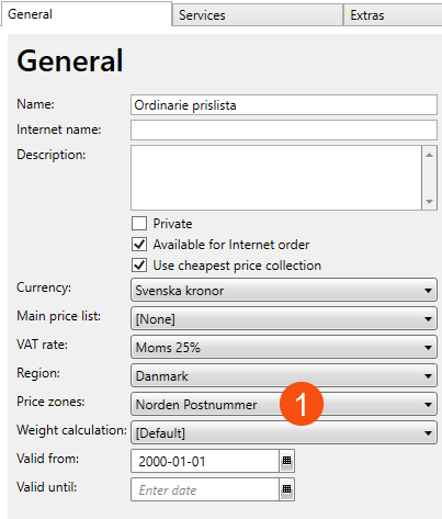 The settings are exactly the same, except that the new price list editor makes it possible to select a price zone collection directly from the price list (1). It is no longer controlled by the list of services. |