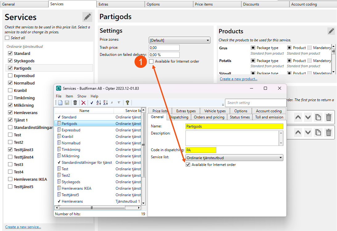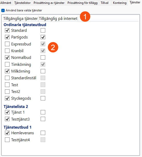 The setting is done directly on the Teenused tab for each service (1). When a new service is created, by default it is not available on the web portals; the checkboxes for all services that are to be available have to be selected, either in the service registry or in the price list. |