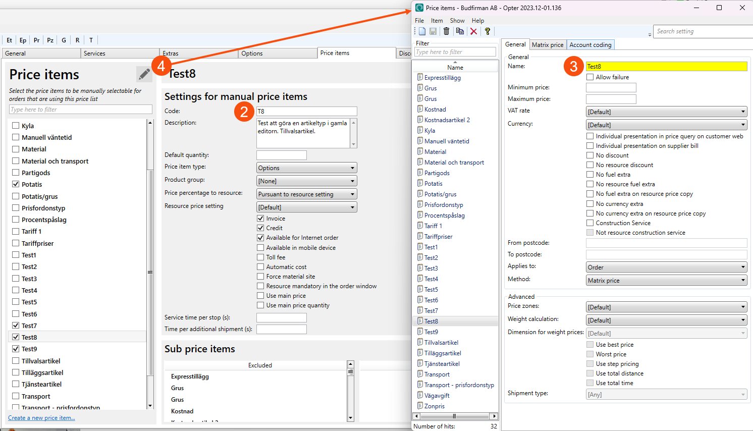 In the new price list, the code for the price item is entered on the Manuaalse hinnaga kaubad tab of the price list editor (2), but the name of the price item is entered in the price item registry (3).