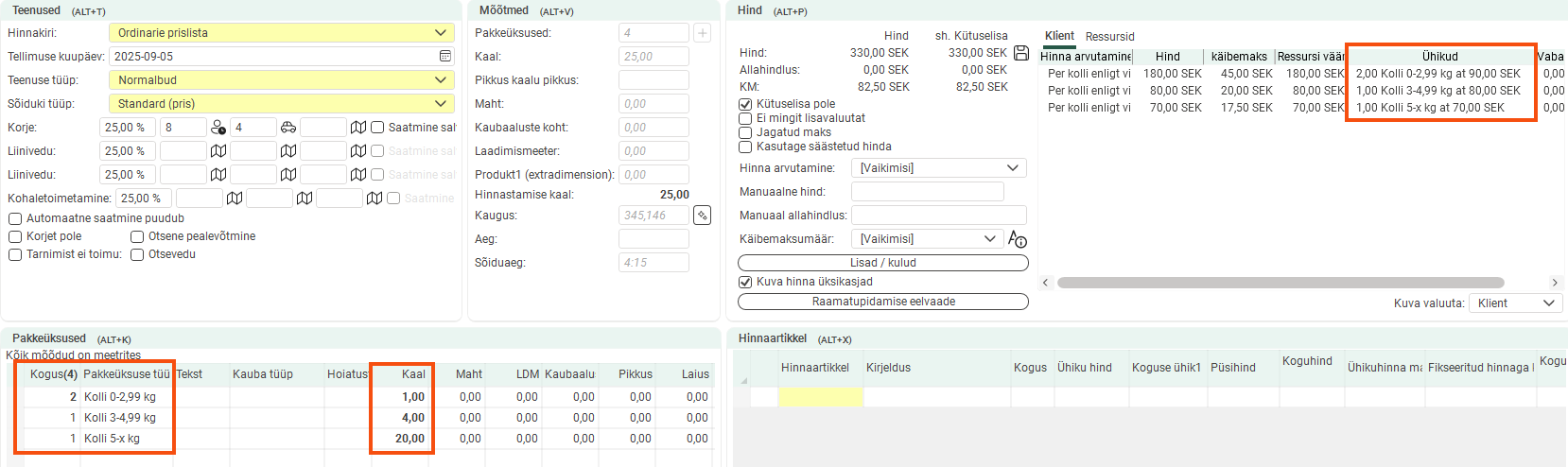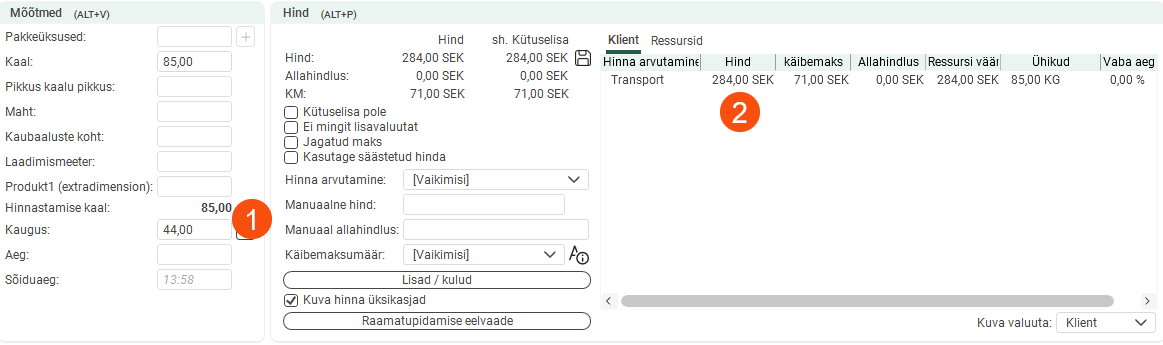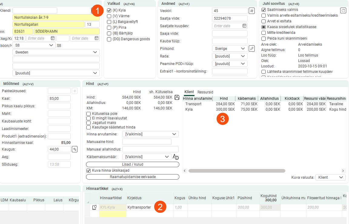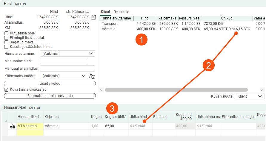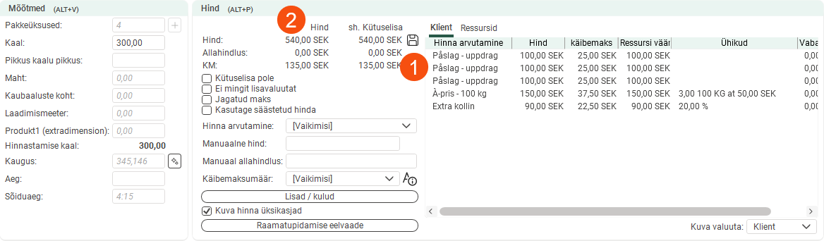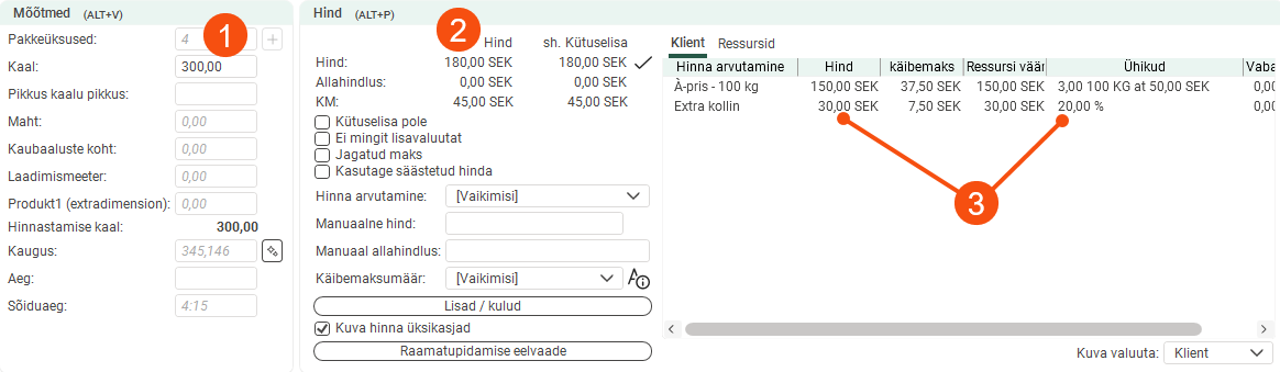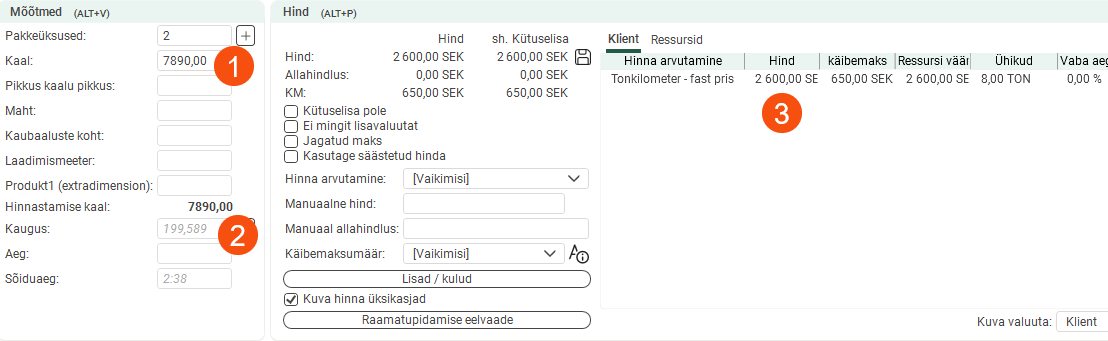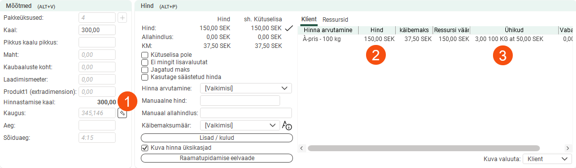The pricing weight of the order below is 300kg (1). The price is 3 × 50 = SEK 150 (2). Under Ühikud, you can see the number of units on which the price is based (3).