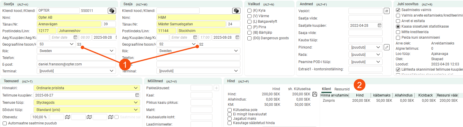 In the example below, the order goes from price zone S3 to S2 (1), resulting in a price of 200 SEK (2).