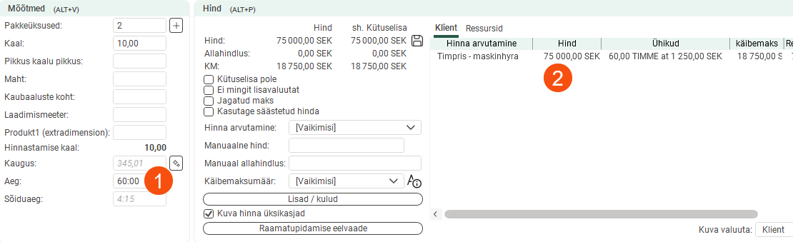 If we hadn’t ticked Sammu hind on the price item, the price would have been calculated straightforwardly: 60 hours × 750 SEK = 45,000 SEK.