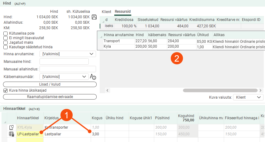 On the order below we have added three pallets as extra sales totalling 450 SEK (1). If we look at tab Ressursid, we can see that the sum not is included in the resource value on which the supplier bill is based (2).