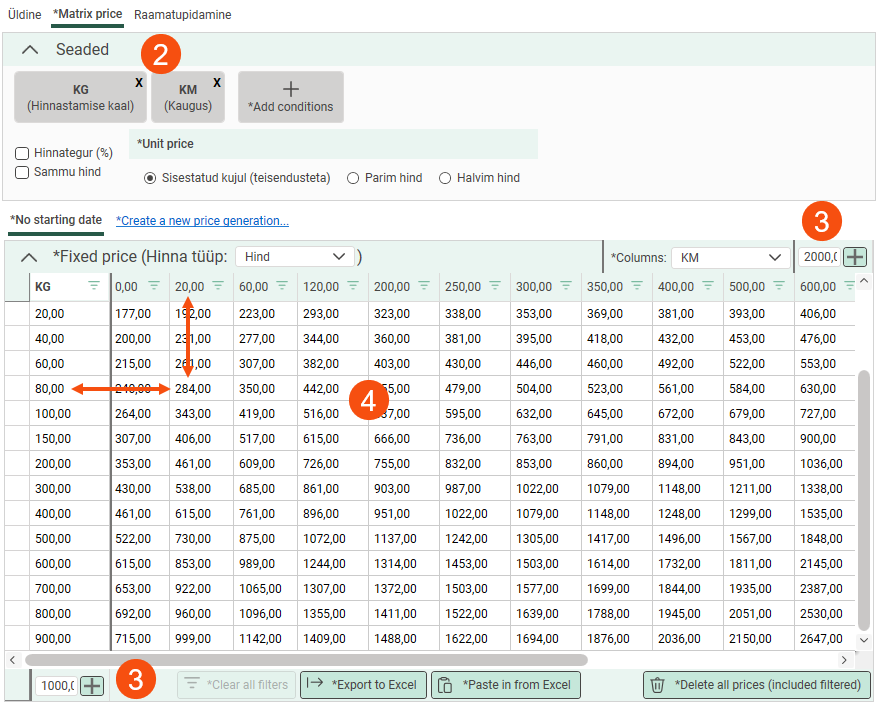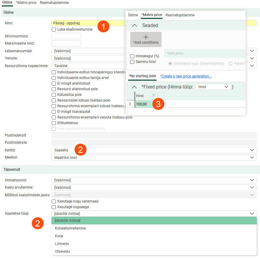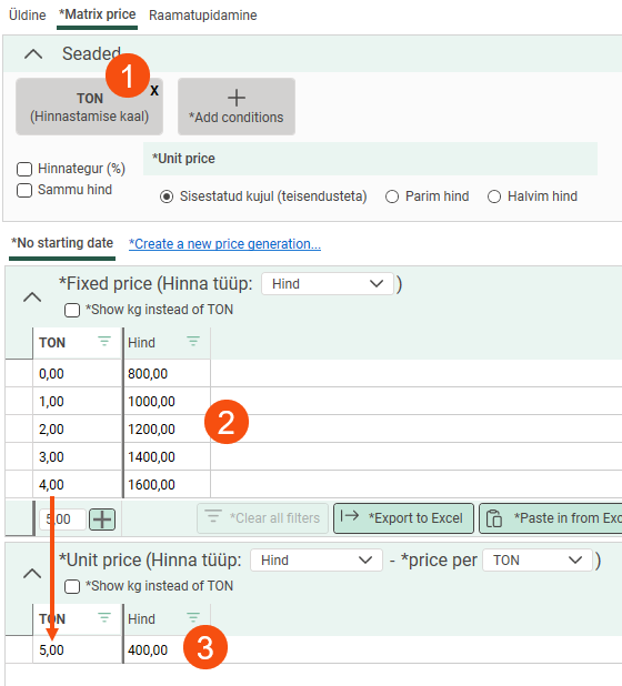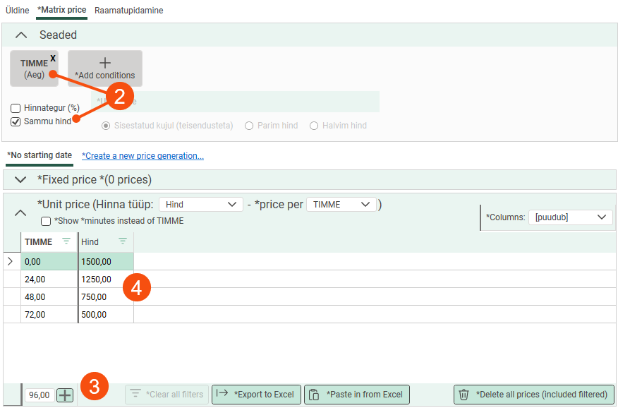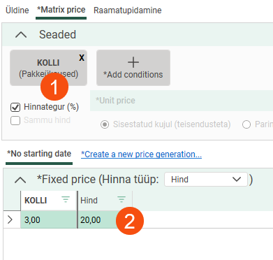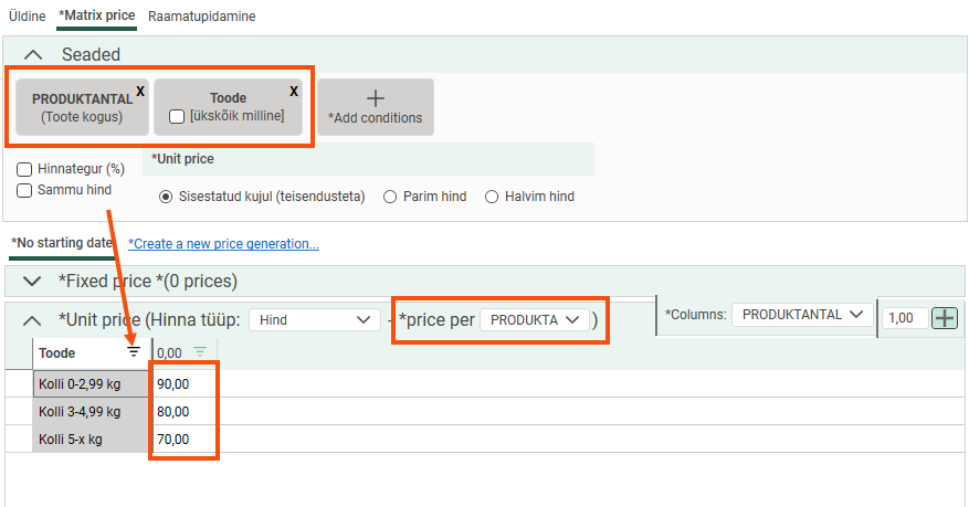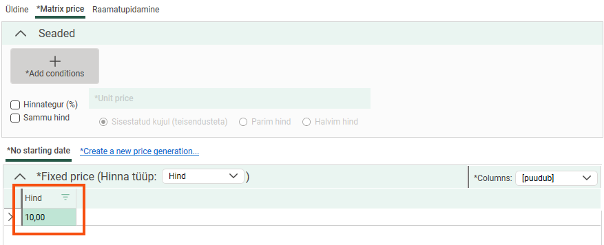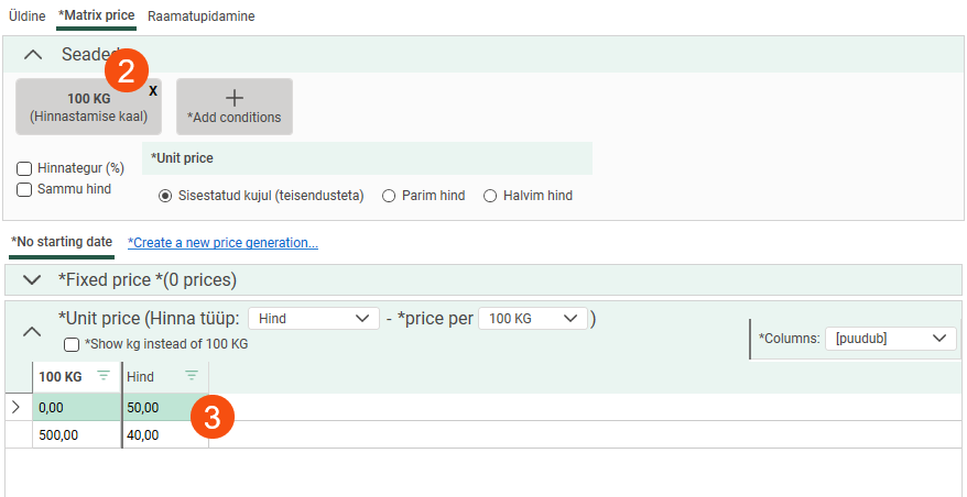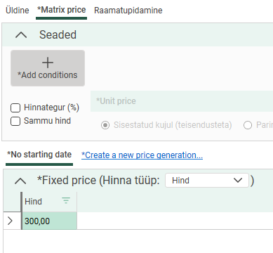 Add the condition to the price matrix. In brackets, you can see which dimension of the order is the price basis. Select Sammu hind.