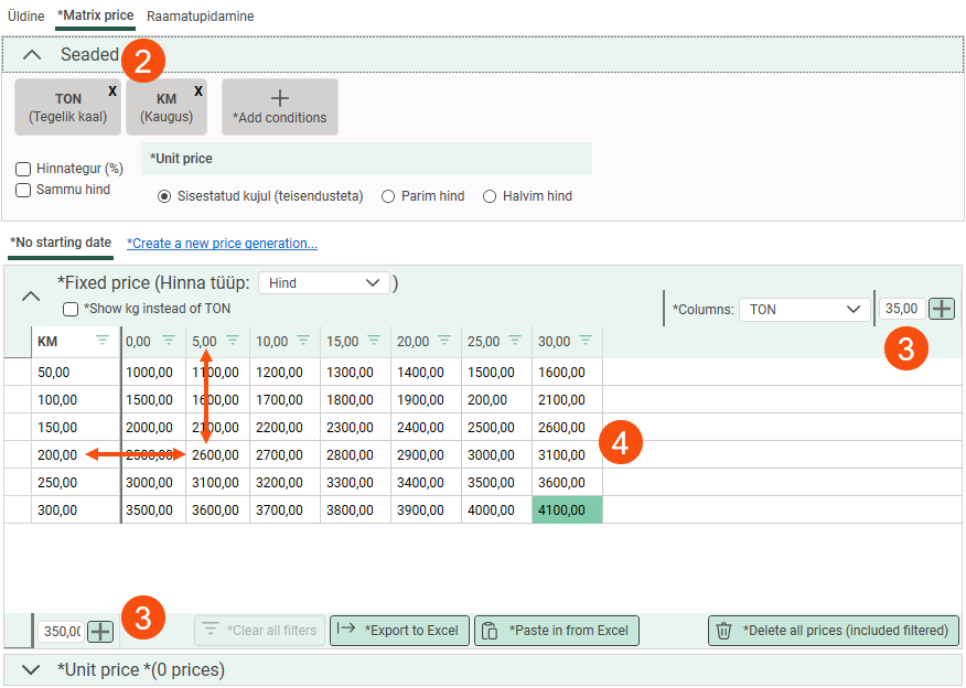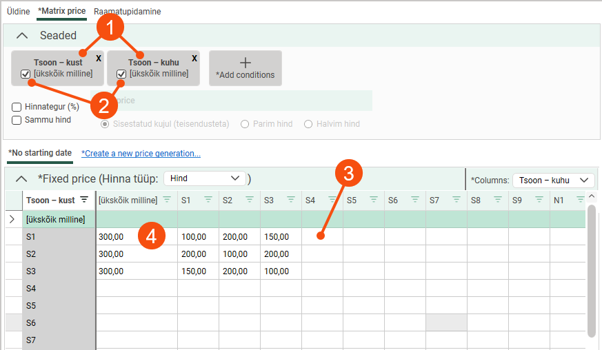 If you do not want to enter prices for all zone combinations, or if the price is the same for many zone combinations, you can select [ükskõik milline] (2) and enter a price for it in the matrix. If an order is assigned a zone combination for which no price is available, such as S1–S4 in the example below (3), the price for S1–[ükskõik milline] is used instead (4). It thus acts as a kind of base price that captures everything.