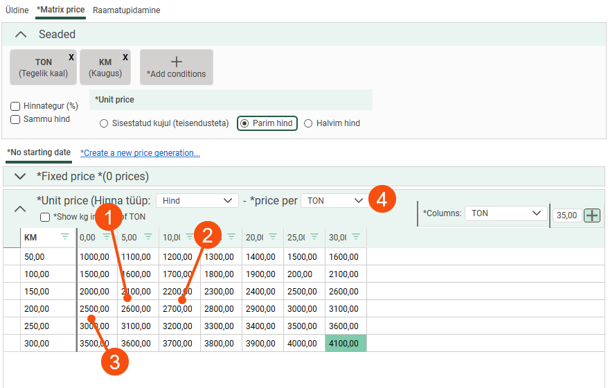 Add the terms "Tonne" and "Km" to the price matrix. In brackets, you can see which dimension of the order is the price basis.