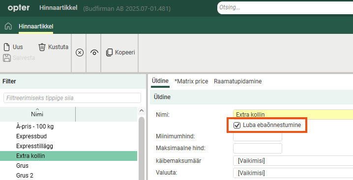 You can also tick the price item on the Manuaalse hinnaga kaubad tab, and it will be added manually to the price item lines. Just make sure the price item type is Valikud. If it is Teenus, other price items will be removed from the price rows when you add it.