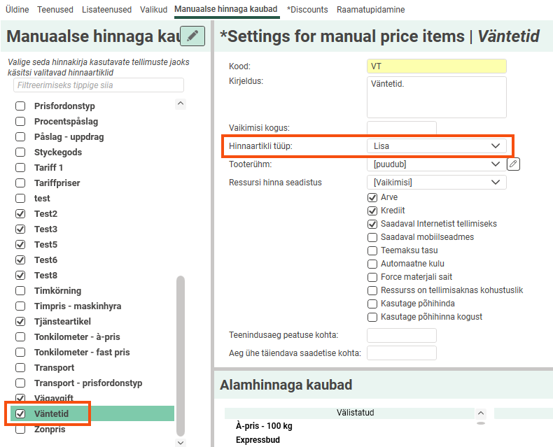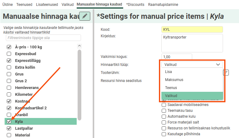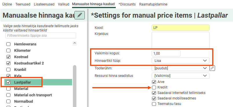 Tick the price item in the list on the Manuaalse hinnaga kaubad tab in the price list. Select Lisa as the price item type and deselect Krediit. We have also filled in "1" as the default number. The number can be changed on the item line of the order.