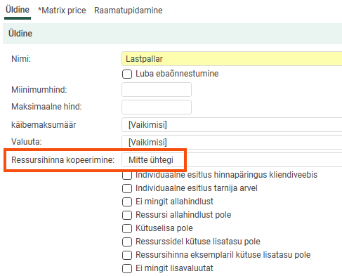 Go to the Üldine tab and select Mitte ühtegi from the drop-down menu Ressursihinna kopeerimine.