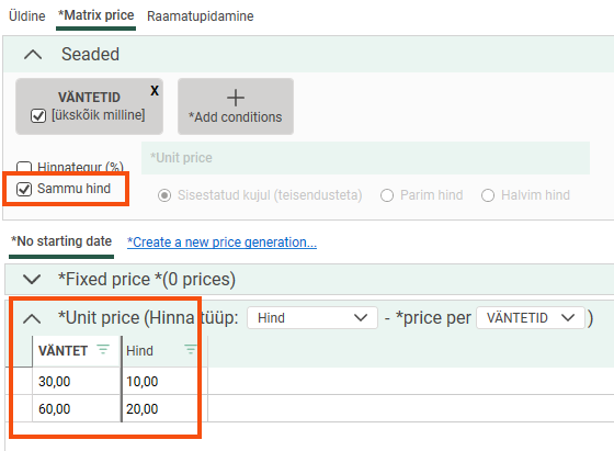 Select Sammu hind and enter the prices under Unit price, as we want a wait of 30–60 minutes to cost 10 SEK per minute and, from 60 minutes onwards, 20 SEK per minute.