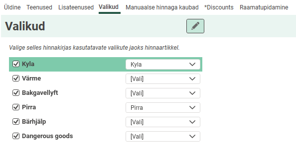 Go to tab Valikud in the price list and select the price item for the “Cooling” option.