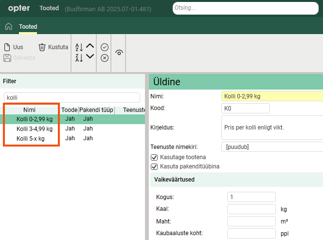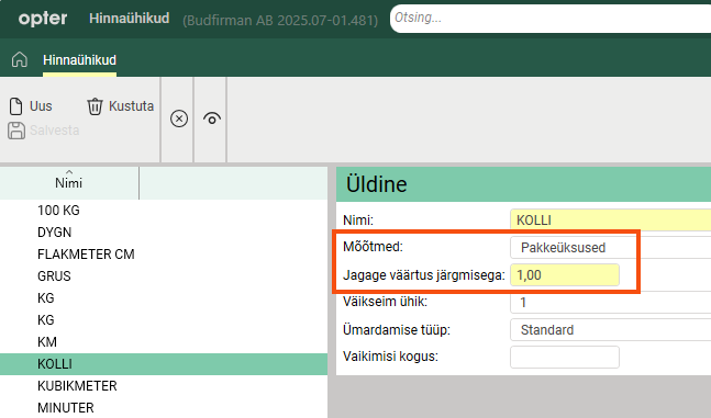 Add the price units "KG" (based on weight or pricing weight) and "KM" (based on distance) if they do not already exist. Further information about the settings can be found in Hinnaühikud (window).