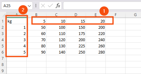 The horizontal unit in Excel should not have any column or row headings, only values, and they must be on row 1 of the file (1). In the example below, row 1 is the kilometre interval.