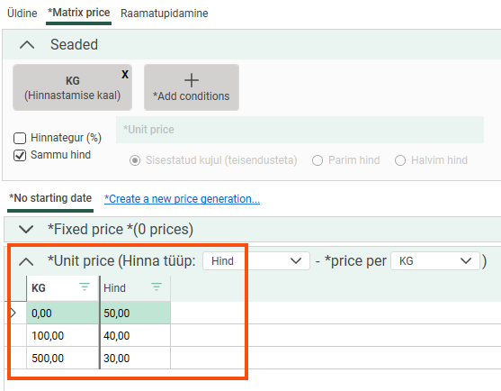Prices are then handled differently depending on the settings in the price matrix. You can choose whether to calculate the prices separately for each range and add up the subtotals (tick Sammu hind), or calculate the price straight, the number of units × the price for that range (tick one of the options under Unit price).