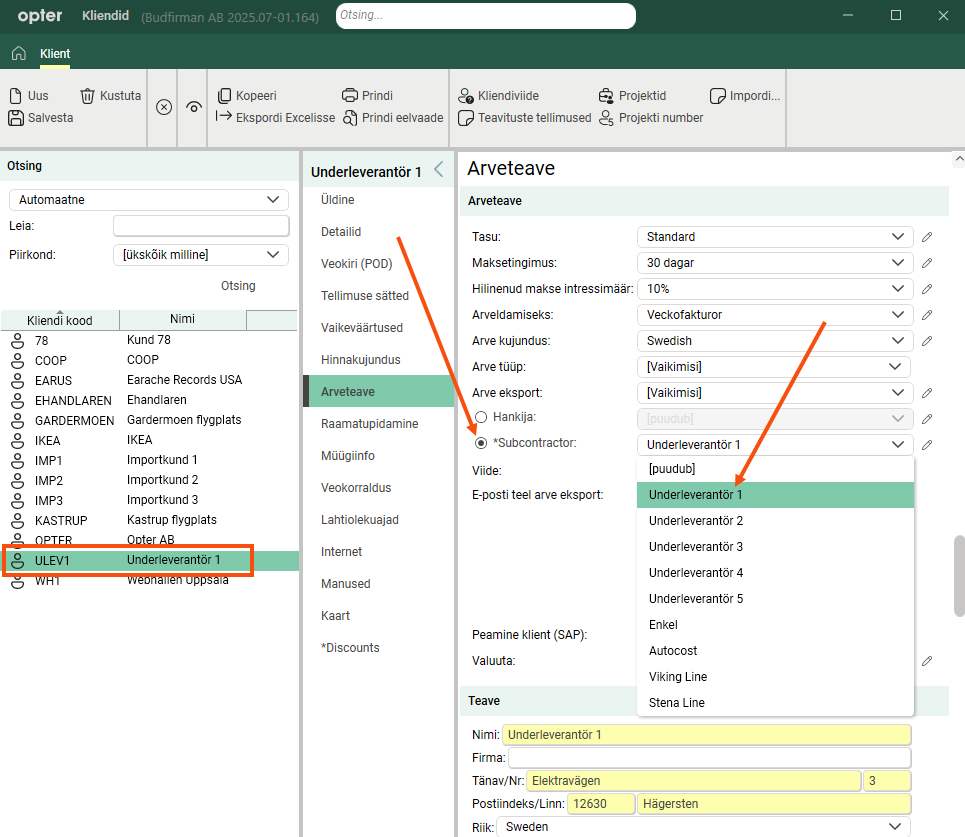 Add the subcontractor as a customer and select the subcontractor in the tab Arveteave. Create an order and invoice the deductions as usual.