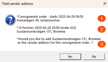 The proposed new start address will appear in a pop-up window. If you want the new start address to be added, answer Yes/Jah to the question in the pop-up window.