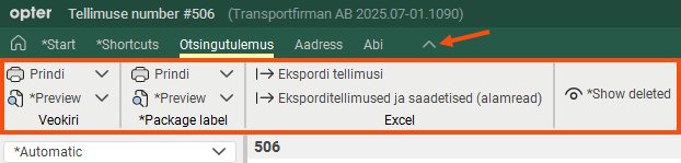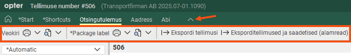 If you want to open and pin the ribbon menu, double-click on one of the menu tabs (for example, Otsingutulemus) or click once on the down arrow.