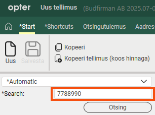 Select Automatic and enter the Order number, Invoice number, Consignment note number, Parcel number, Consignor reference, Consignee reference or Extra ID 1-Extra ID 5 in the search field. Press Otsing or Enter. Opter then searches for orders with order dates in the last three months.