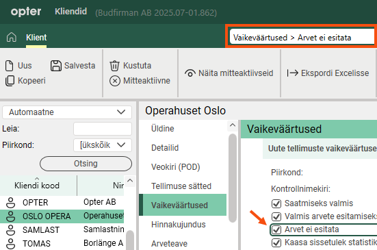 In the image above, we have pressed Ctrl + L in the customer register, typed the name of a tick box (Arvet ei esitata) and pressed Enter. Opter looks for the tick box in the register and marks it so that we can find it quickly.