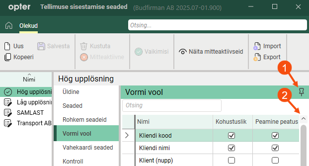The image below shows what it looks like in the Tellimuse sisestamise seaded window when you have tabbed Vormi vool. The scroll bar of the list (2) is still displayed, but the window's scroll bar is not displayed. The list of settings has been maximised.