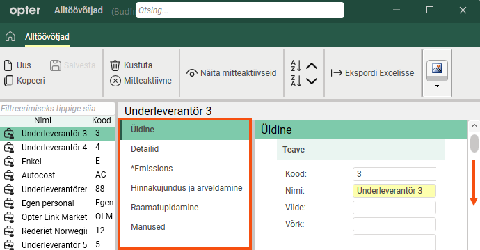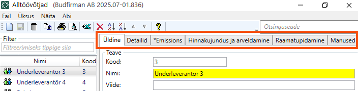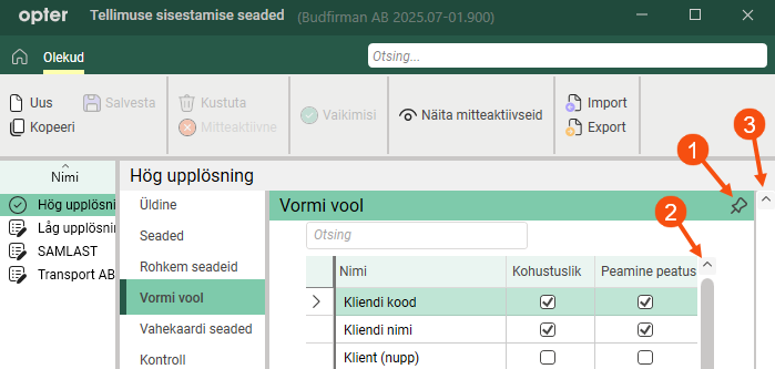 The picture above shows what it looks like on the Vormi vool tab in the Tellimuse sisestamise seaded window if you have not pinned the tab. Both the list scroll bar (2) and the window scroll bar (3) are displayed.