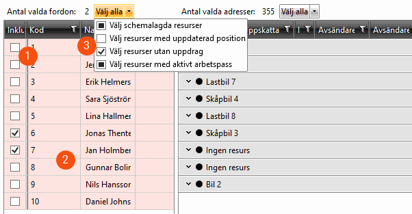 In the example in the image below (3), all vehicles are selected except those that do not have a current position and already have shipments assigned to them. It does not matter whether the vehicles are logged in or not.
