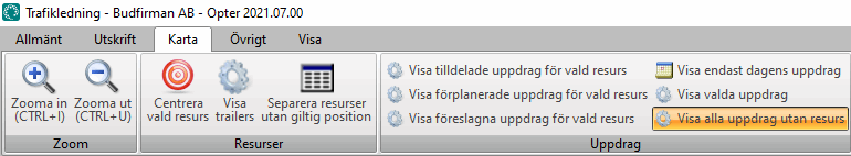 To only view shipments that have not yet been assigned on the map, select Kuva kõik saadetised ilma ressurssideta from the Kaart menu and deselect all other options.