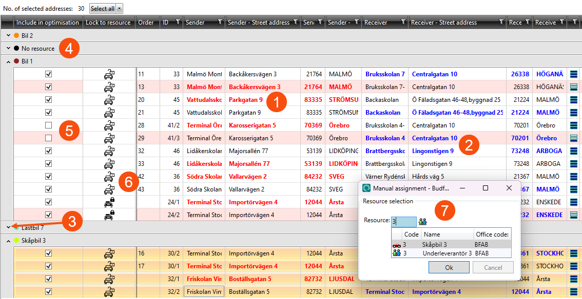 Shipments can be assigned by selecting them in the list, pressing Ctrl + M and then selecting the new resource in the dialogue box that opens (7). The shipments are then locked to the new resource so that they are not moved to any other resource when calculating the route sequence.