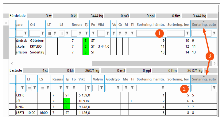 The Sorteerimisjärjekord – Auto column (3) shows the next stop, regardless of whether it is a pickup or a delivery. Lowest number = next stop.