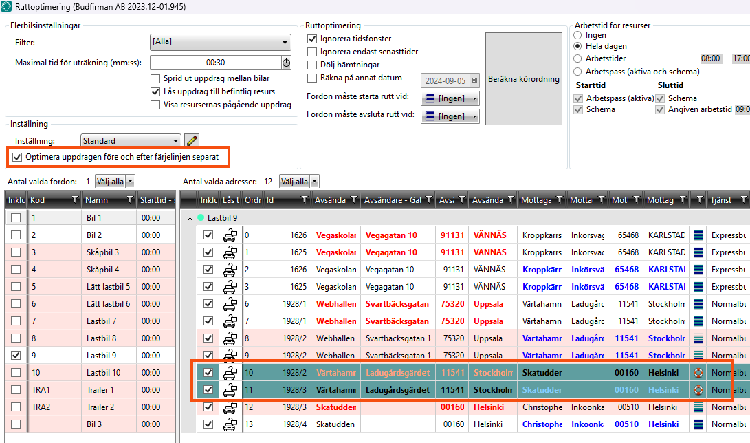 Click on Arvutage sõidujärjekord and the shipments before and after the ferry line are optimised separately, and the entire ferry shipment (departure and arrival addresses) is kept together.