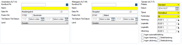 Create an order with the sender’s address “Akademigränd 3, 111 52 Stockholm” and the recipient’s address “Storgatan 2, 211 41 Malmö”.