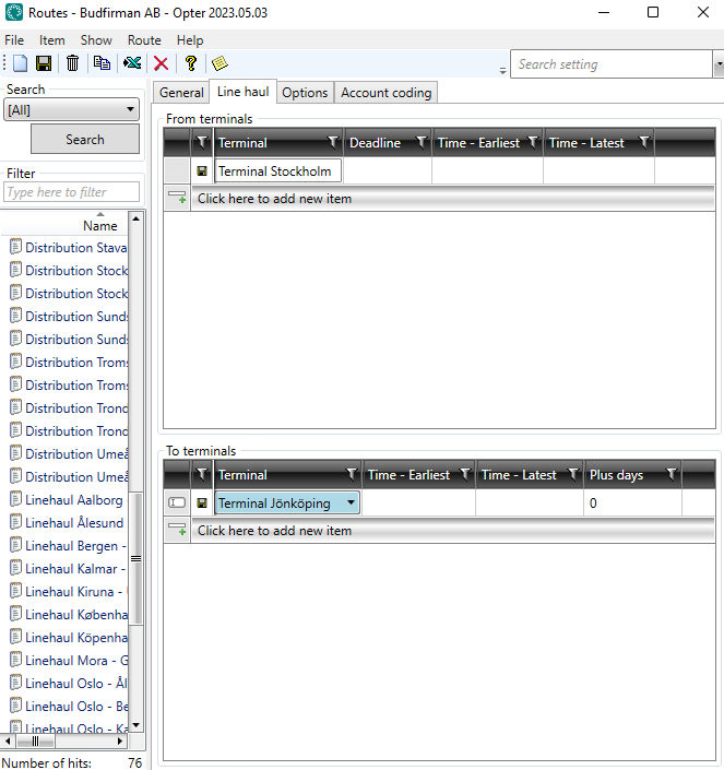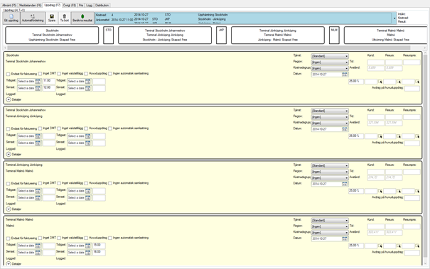 This example illustrates a route where goods can be transported from Stockholm to Gothenburg and Malmö via transhipments at terminals along the way.