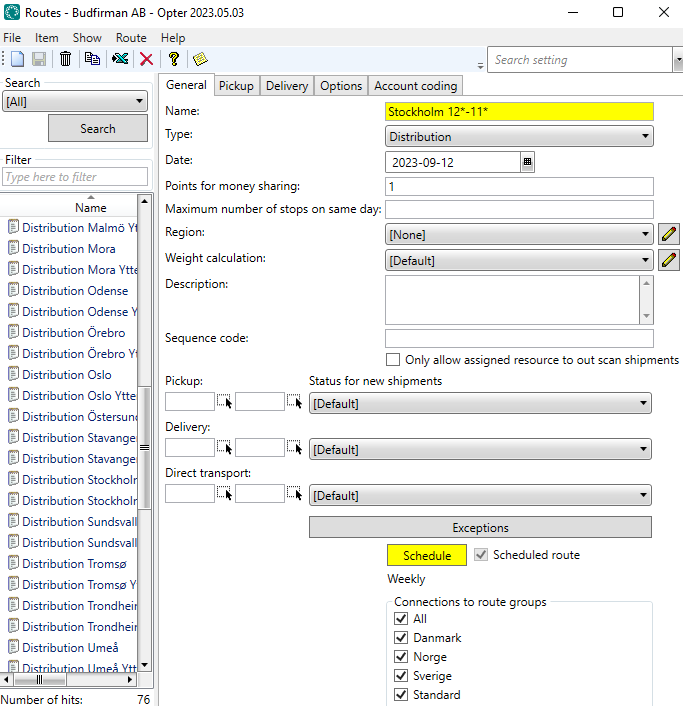 We want to create a route from the area of Stockholm where postcodes begin with 12 to the area where postcodes begin with 11. It is to be a distribution route.