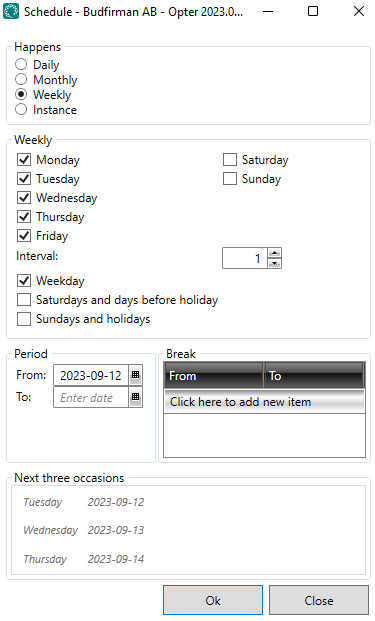 Set the route schedule in Iganädalane, and select Monday to Friday. For more information, see Ajakava, routes (window).