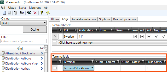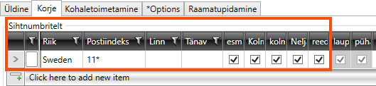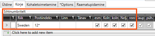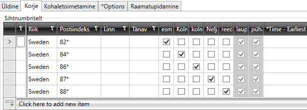 We click on the Korje tab and create a new row below Sihtnumbritelt. We select Riik “Sweden” and enter “12*” in the field Postiindeks.
