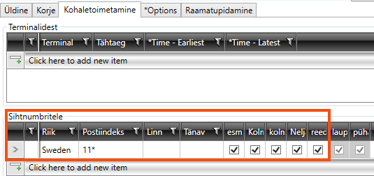 Go to tab Korje and create a new row below Sihtnumbritelt, where you select Riik “Sweden” and enter “11*” in the column Postiindeks. We are selecting esmaspäev through to pühapäev, as we want the postcode area “11*” to be served for collection on those days.