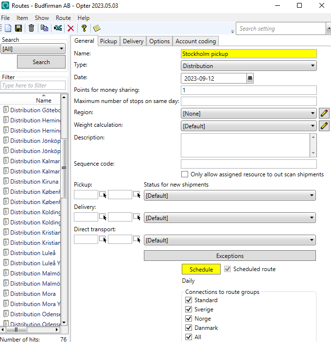 We click Tellimus > Marsruudid > Uus to create a new route, which we’ll call “Stockholm Pick-up”.