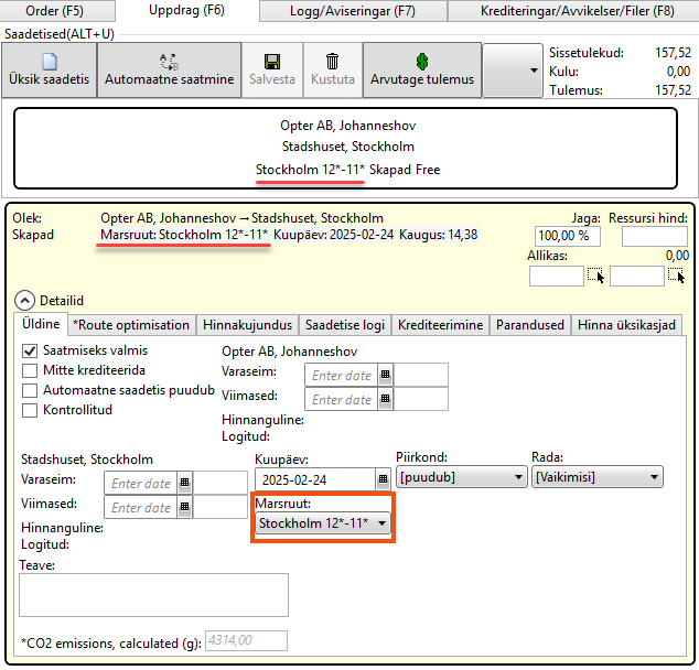 Under Saadetised in the order reception section, we can now see that an order from a sender with the postcode “120 07” to a recipient with the postcode “111 52” has been assigned to the route “Stockholm 12*–11*”.