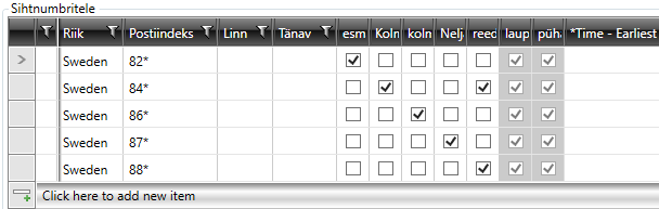 Go to the Korje tab and add a row for each postcode area under Sihtnumbritelt. Select the day of the week on which each postcode area is to be served.