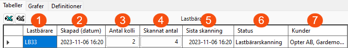 Load carrier (10) shows which load carrier (load carrier ID) the package is part of. If the field is empty, it means that the package was not part of a load carrier at that scan.
