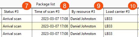 The example in the image above shows that an arrival scan was recorded for all three packages on 7 March 2023 by the resource "Daniel Johnston". All three packages are part of the same load carrier with the load carrier ID "LB33". (In this case, it is the load carrier's label that has been scanned with the arrival scan type, and the arrival scan has then been recorded for all the packages that were in the load carrier at that point in time).