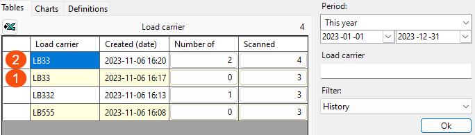 The list shows one row per time a specific load carrier (a load carrier ID) has been used according to the following two scenarios: