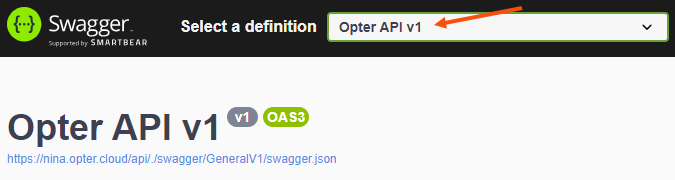 The drop-down menu is located in the top-right corner of the webpage Select a definition. Select "Opter API v1".