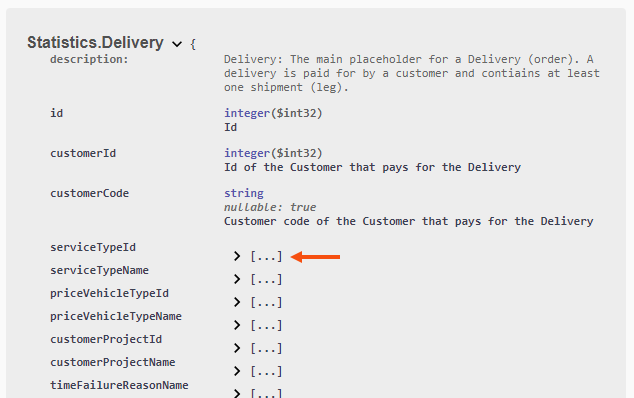 Details of what data is retrieved if you select "true" for includeDeliveries and includeScans, for example, are shown further down the swagger documentation under Schemas. Click on Statistics.Delivery and Statistics.Scan. Click on "[...]" to see more details.