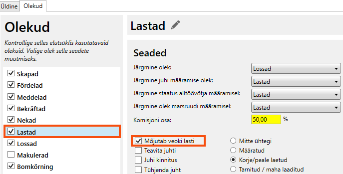 Ensure that the checkbox Mõjutab veoki lasti is ticked for the statuses you require.