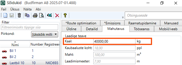 Click on Register > Transpordivahendid and the Mahutavus tab. The Laadige teave box contains the field Kaal. The field Kaal indicates the maximum weight that the vehicle can carry.