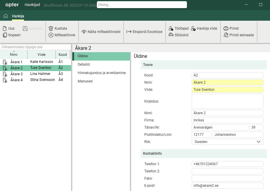 Some of the information you enter for the haulier on the tabs Üldine, Detailid and Hinnakujundus ja arveldamine is sent with the settlement export from Opter to financial systems such as Fortnox, if the systems are linked (integrated). For more information, see Supplier bill export to Fortnox.