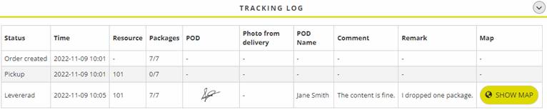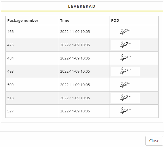 The list shows which package IDs have been delivered, when they were delivered (date and time) and the receiver’s signature on the proof of delivery.