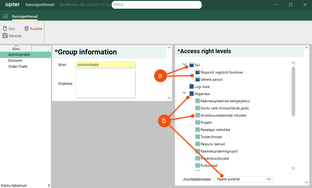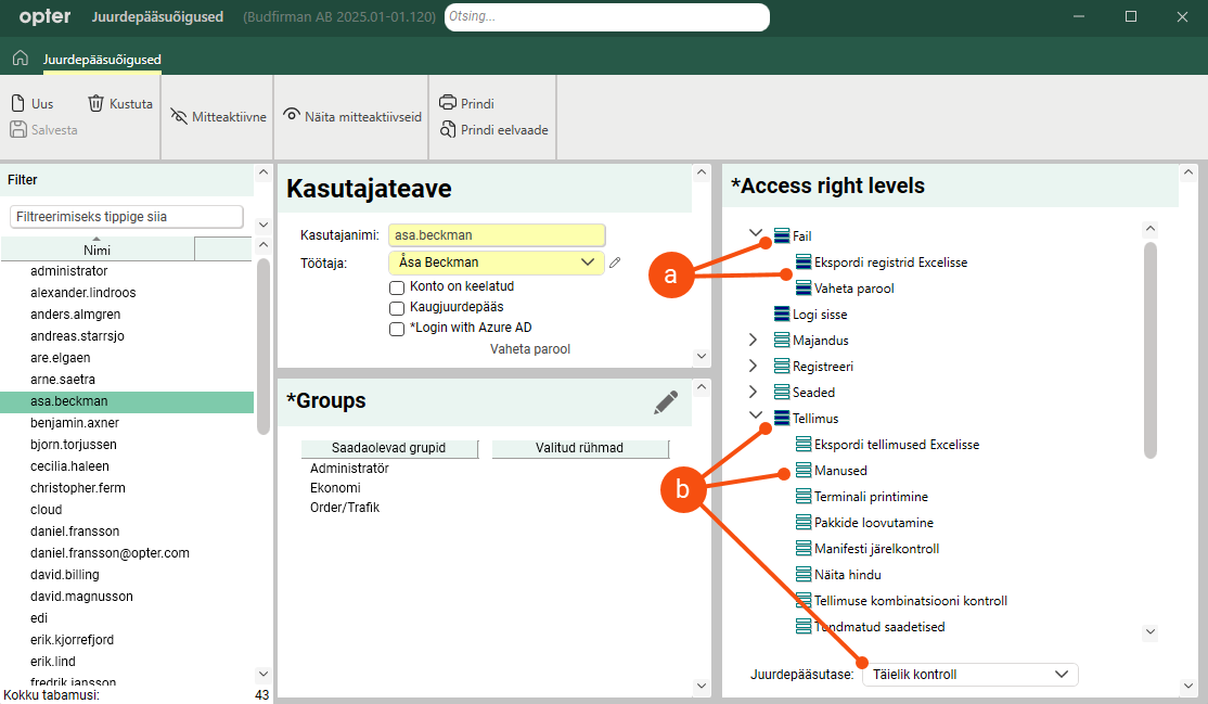 It is also possible to mark a function and select an access right in the Juurdepääsutase drop-down list at the bottom of the window. If you do it at a parent level, the authorisation for the child functions on that menu will not apply, so you will also need to set the authorisation for the individual functions that users should have. In the image below, Täielik kontroll has been set at the Tellimus level, but users are not authorised to access these child functions (b).