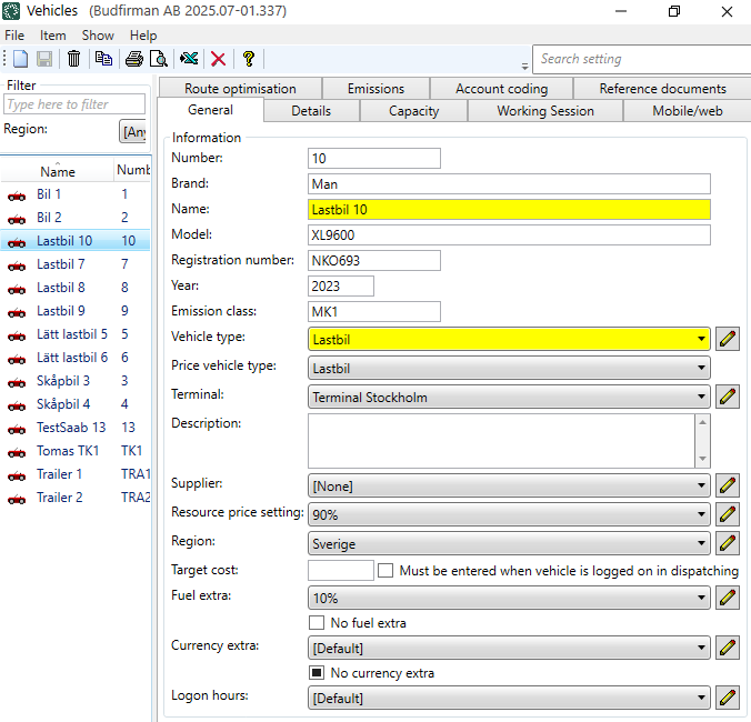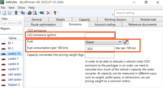 If you want Opter to be able to calculate CO2 emissions based on, for example, the vehicle's fuel and fuel consumption, click on the tab Emissions and make settings for the vehicle.